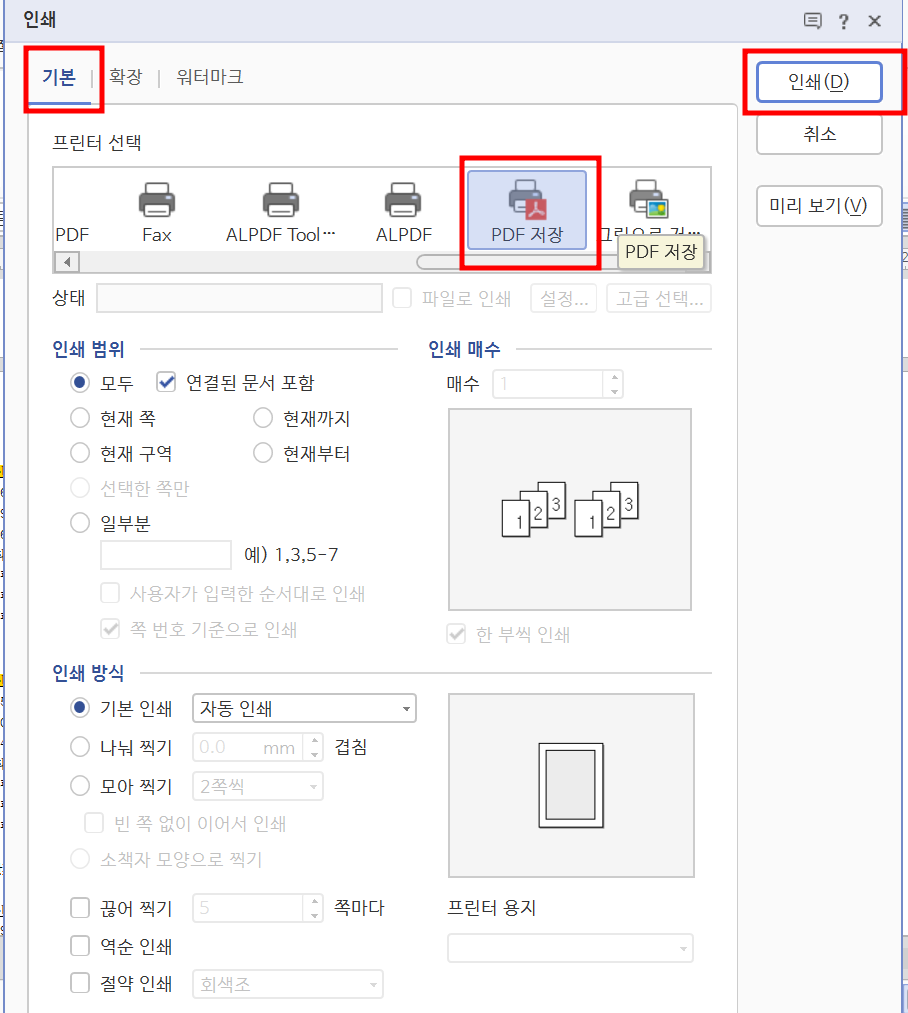 3. 상단 [기본]-프린터 선택에서 [PDF저장] 클릭 한뒤 [인쇄] 클릭