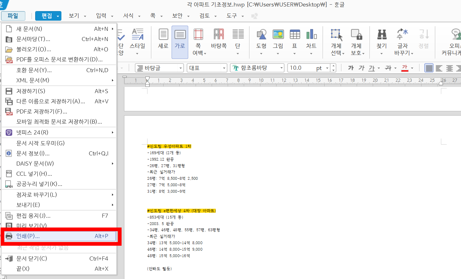 1. [편집]-[인쇄] 클릭